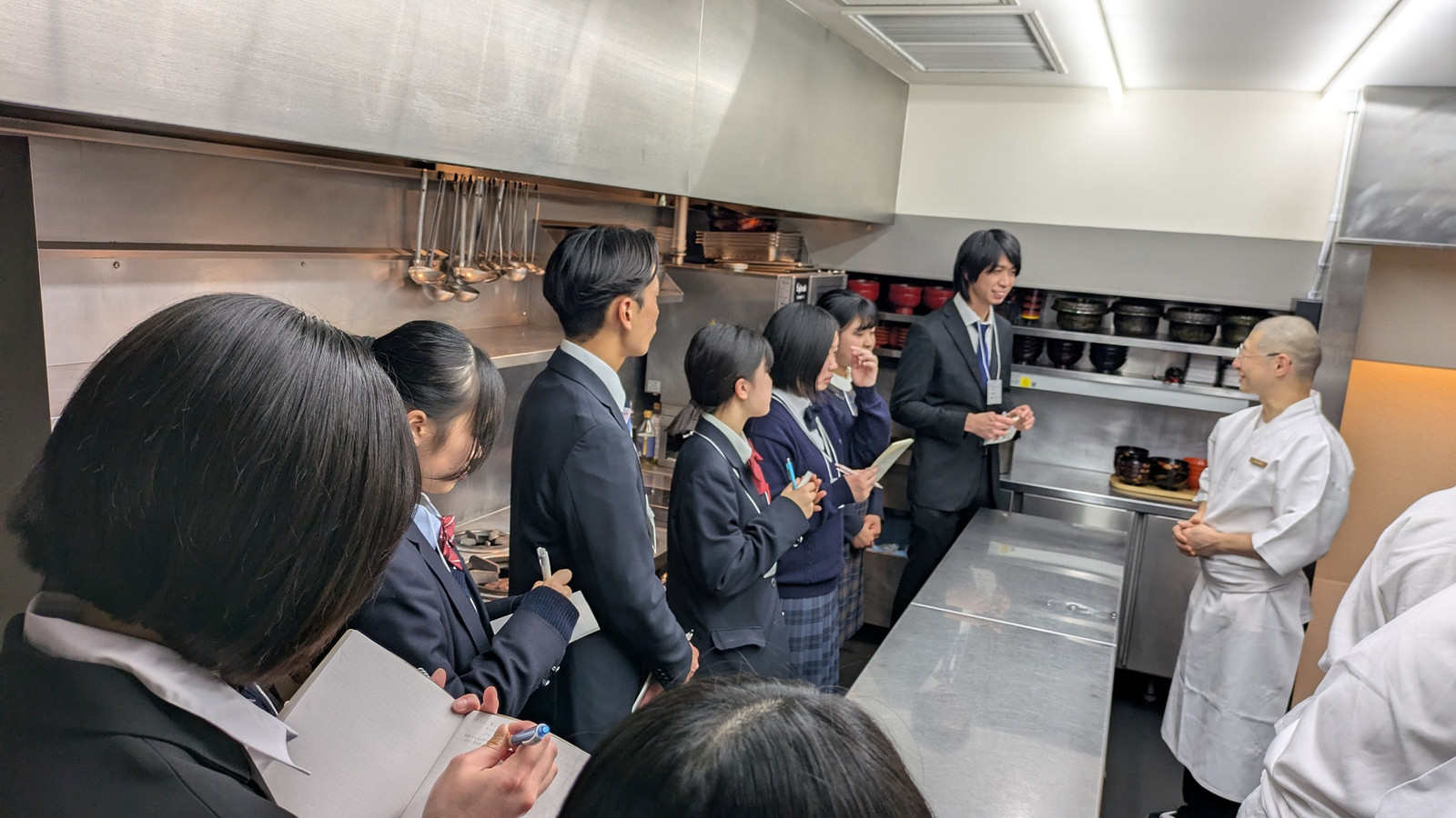 【東日本:虎白】 昨年に続き会場となった「虎白」では、研鑽の一環として石かわグループによる二品の料理が提供されました。学生たちが料理を口にする間も、傍らには常に店主らが寄り添い、終始対話が止まりません。厨房見学で感じた一流店舗の機能美や緊張感、そして食事を通じて絶え間なく交わされる店主らの哲学。教科書では得られない、本物の仕事と志に直接触れる濃密な時間となりました。