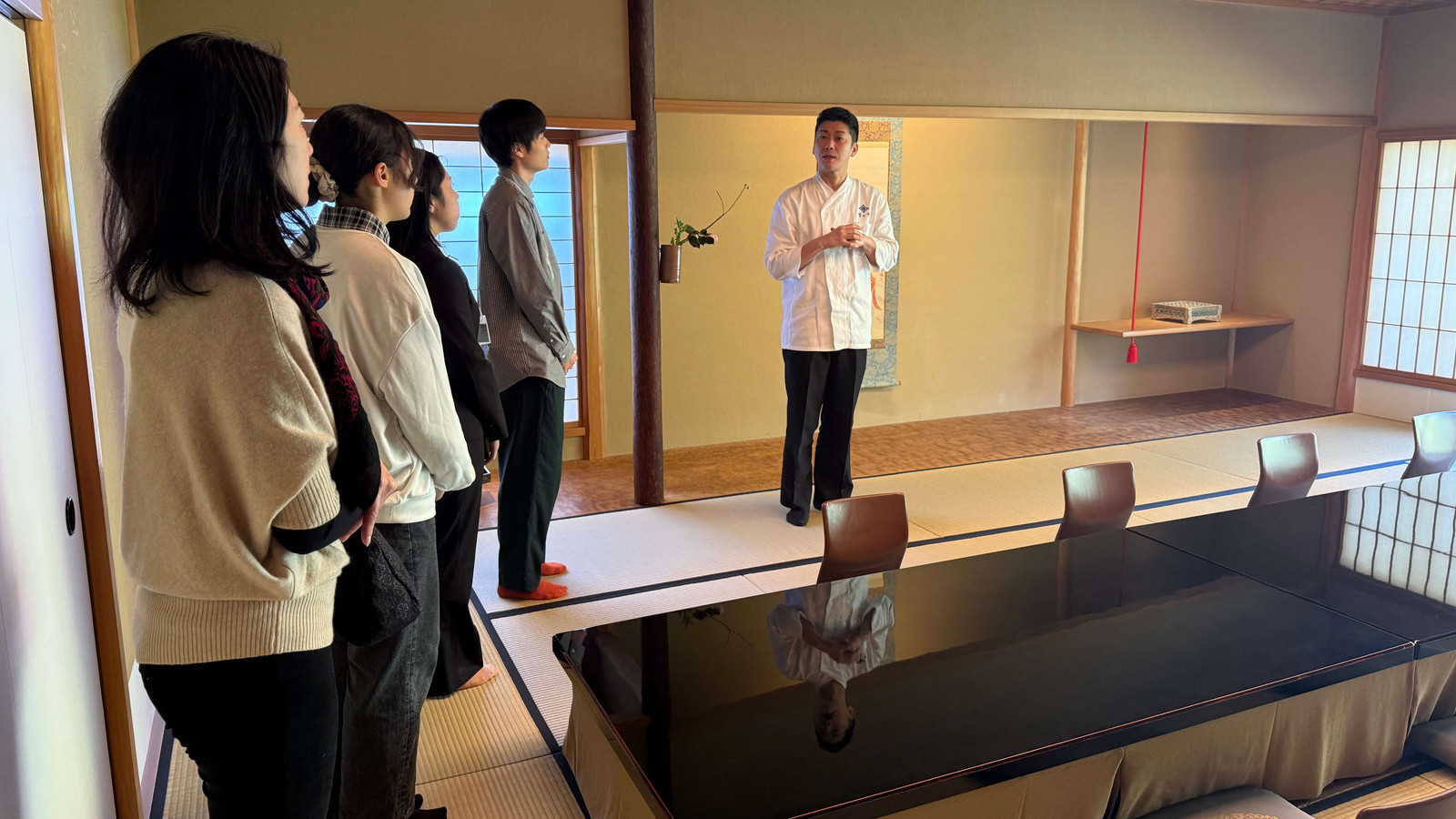 【西日本:菊乃井 本店】 今年新たに会場となった「菊乃井 本店」では、日本文化の深みに触れる広範な体験が提供されました。茶室でのお抹茶と菓子によるおもてなしに始まり、座敷や厨房、さらに別棟の見学までを実施。細部にまで宿る伝統の重みを体感したのち、四代目 若主人 村田知晴氏との対話に臨みました。伝統を継承しながら新たな価値を創造する料理人の姿勢を直接学ぶ、極めて貴重な研鑽の場となりました。